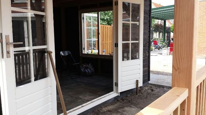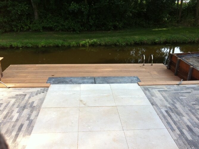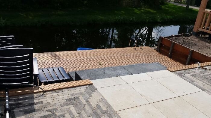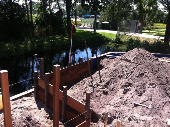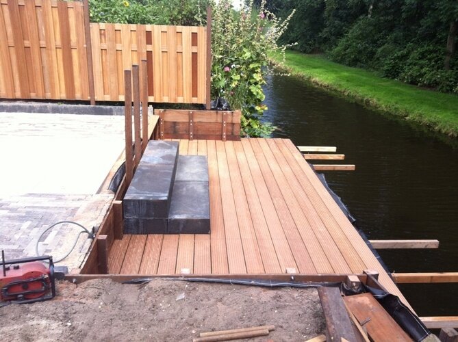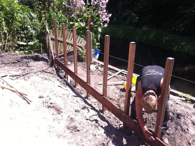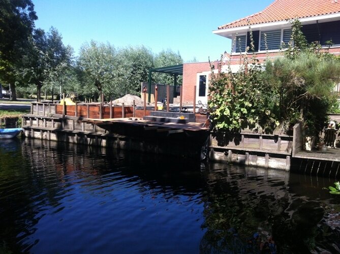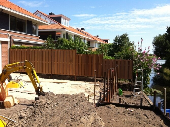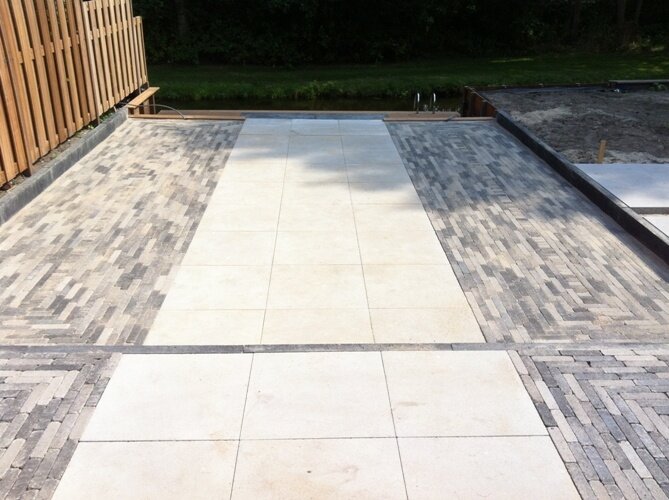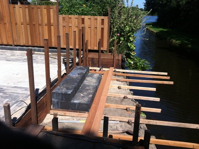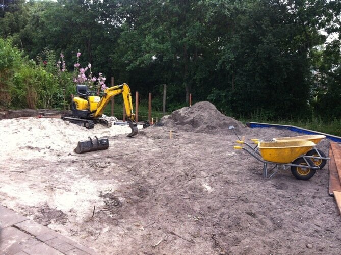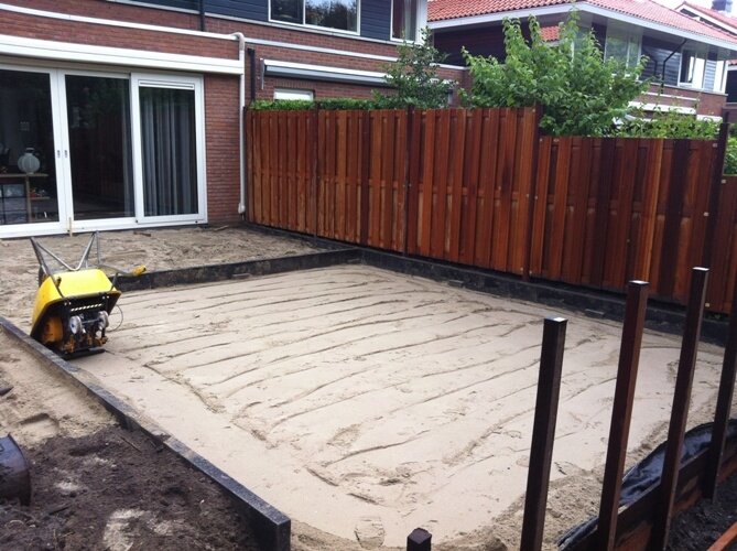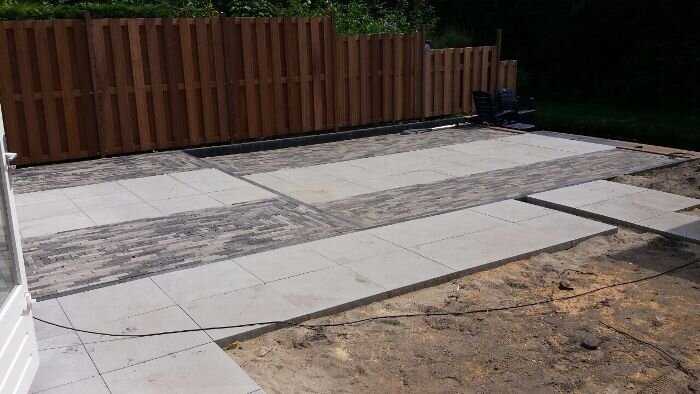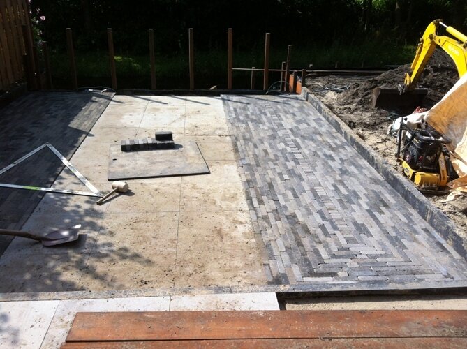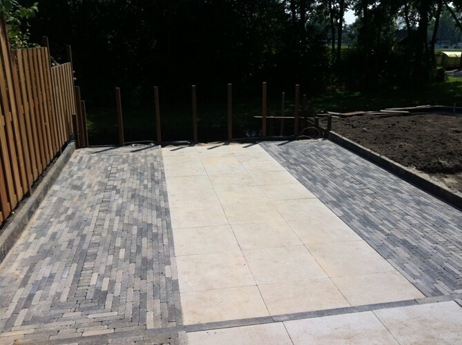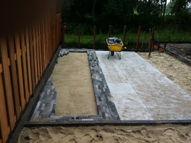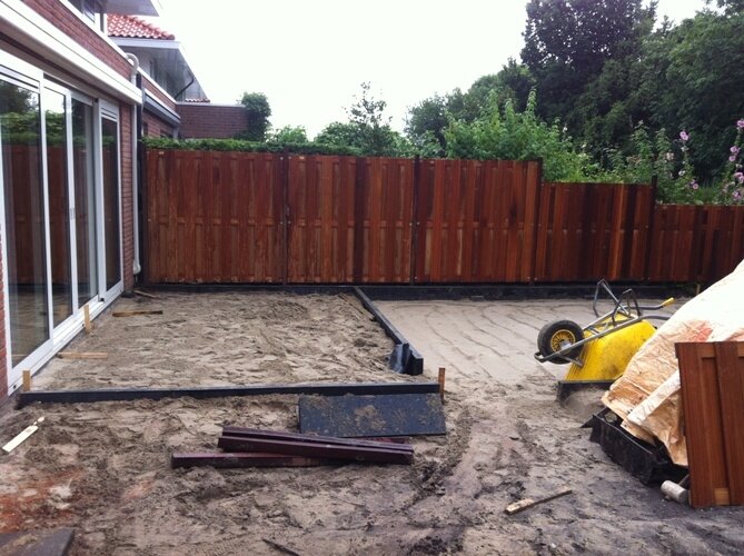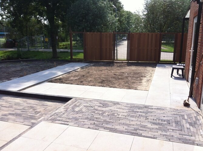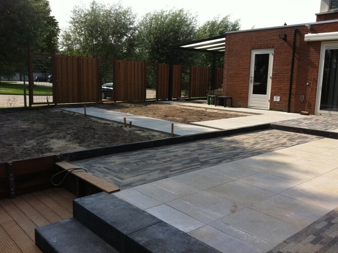 Aanleg zoutziedershof Aanleg van de tuin met diverse hoogtes en verschillende materialen voor een mooi evenwicht in de tuin.